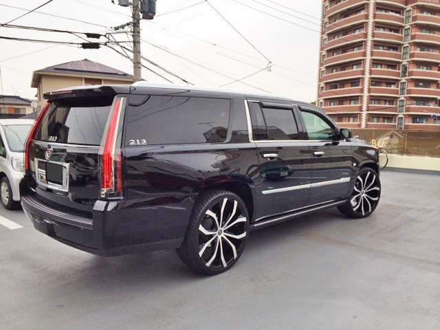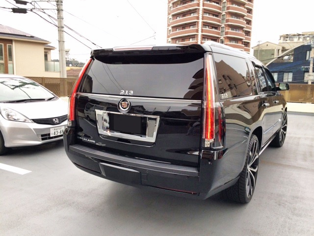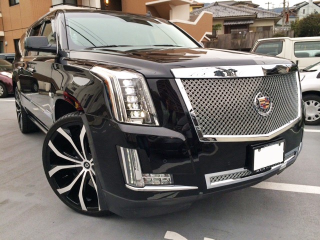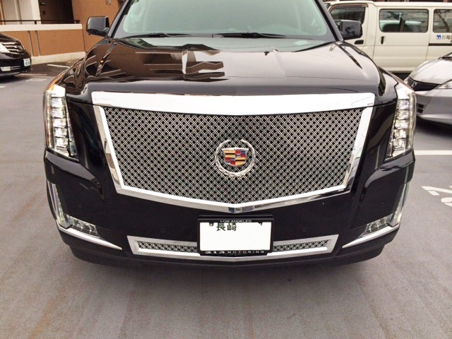 長崎県のH社長に新車 2015y キャデラック エスカレード ESV をご納車させていただきました。 今回ご納車させていただいたESVはかなりカスタムが施されております。中でも一際目を惹くのが、E&Gデュアルウェーブメッシュグリルを上下に装着、リヤタグサラウンドメッシュインサートを装着した強烈なインパクトです。 これだけグリルの開口面積が大きいと、メッシュグリル自体の大きさもド迫力です! バランスよいLEXANI LUST26インチ、ロワリングキットなど、新型エスカレードではまだまだ珍しいカスタムが満載の一台となりました。 H社長、このたびはご用命いただきまして誠に有難うございました。今後ともキャルウイングをよろしくお願い致します。