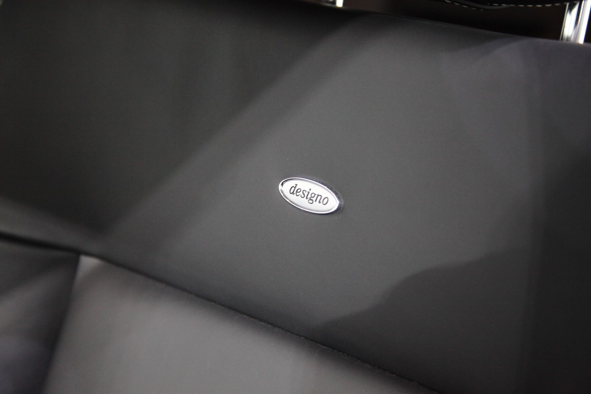 インテリアは落ち着いたブラックとウォールナットのコンビネーションで、オプションのdesignoレザーシートが装着されております。ホワイトステッチで豪華にあしらわれたシートには専用のdesignoバッヂが誇らしげに輝いており、フロアマットもdesigno専用となっております。