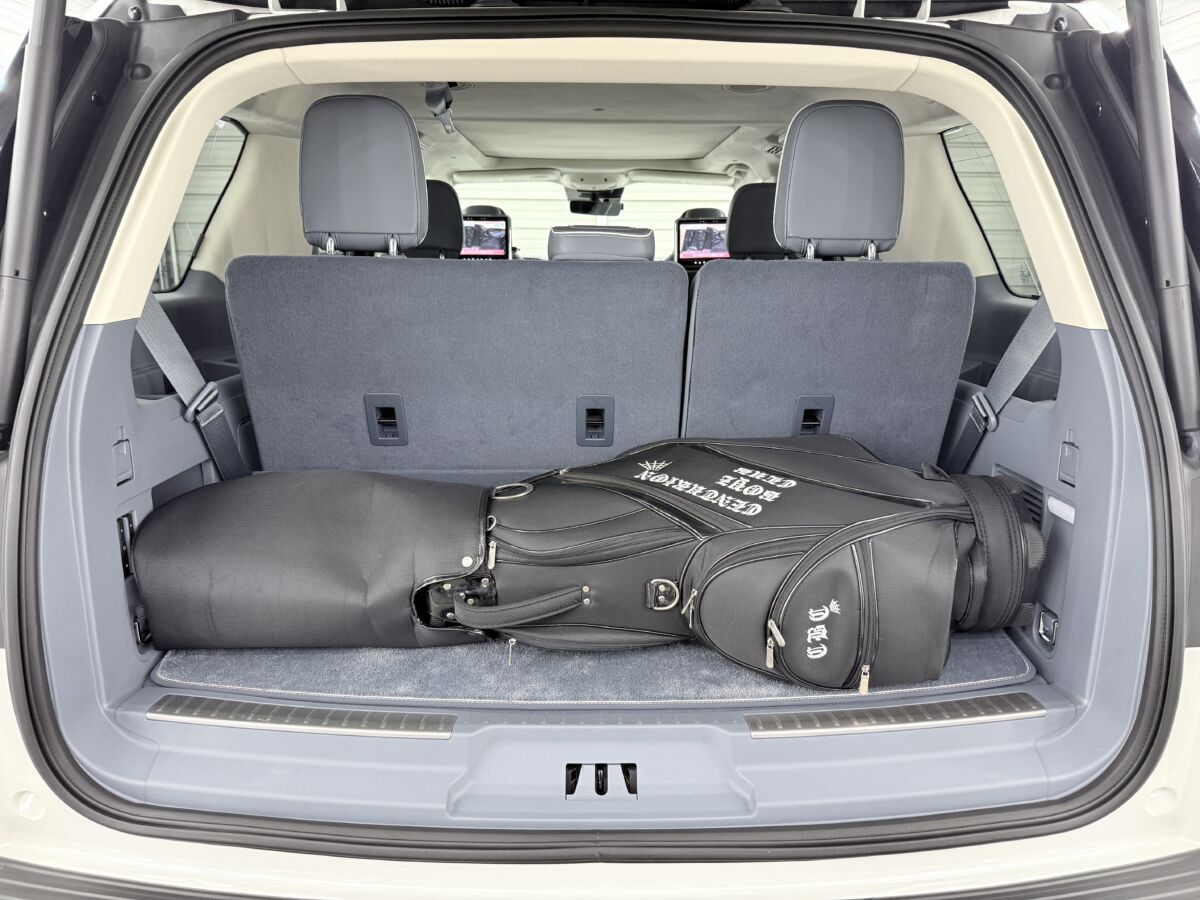 スイッチ一発でフルフラットに早変わり!リヤゲートを開けたインテリアパネルの左側にあるスイッチ操作でセカンドシートフォールディング、サードシートの電動格納が出来ます。ちょっとした床下収納もあります。稼働速度も速いのでイライラすることもなく、誰でも簡単にスムーズに出来るのがポイントです。サードシートも使用する通常状態でもキャディバッグも楽勝です!