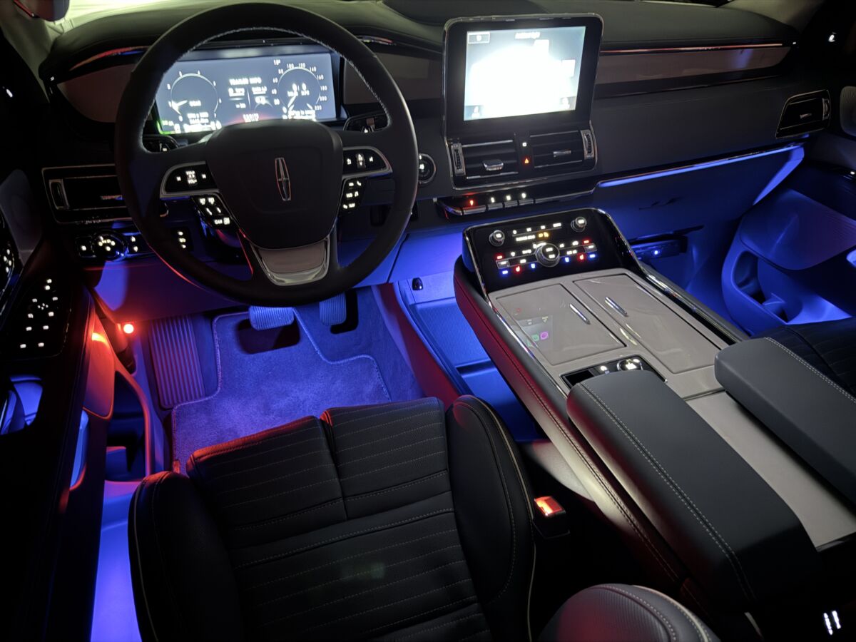 フルLEDのライティング類は、フロントグリルのエンブレムまで光り、 リンカーンスターマークがボディサイドに浮かび上がったりと、見る人が驚嘆するような仕掛けがあるのも高級車ならではですね。