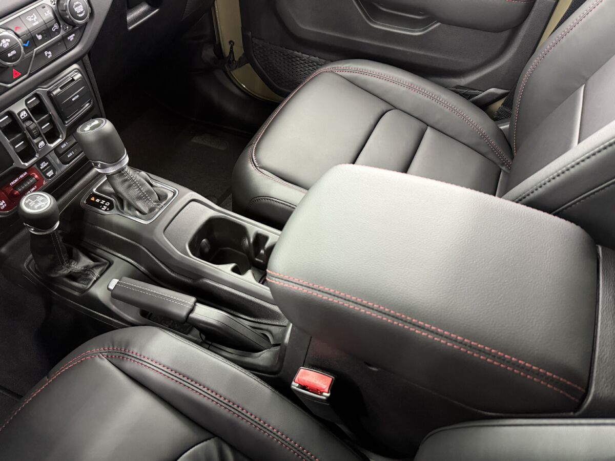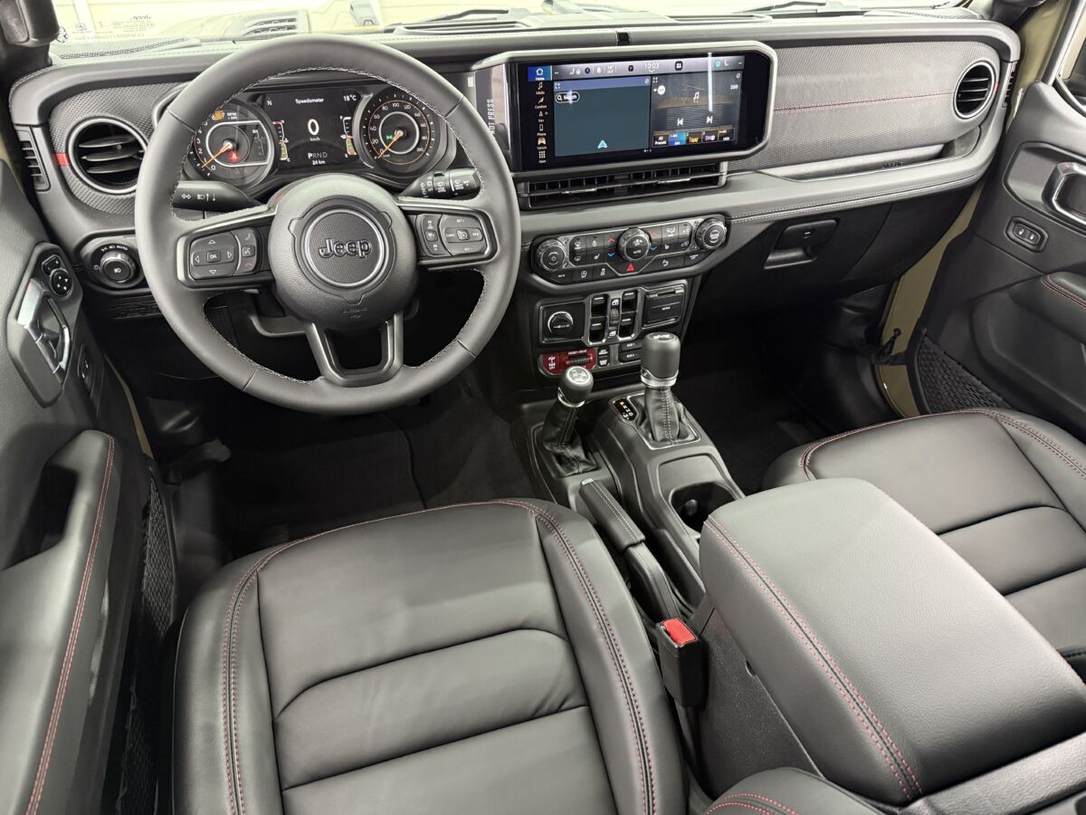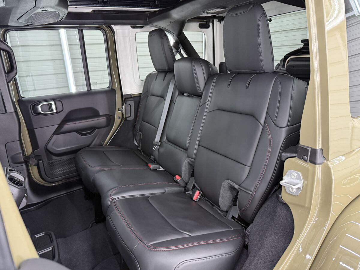 レッドステッチが入る専用のブラックナッパレザーインテリア。シートにはRUBICONロゴが誇らしげに刺繍されています。