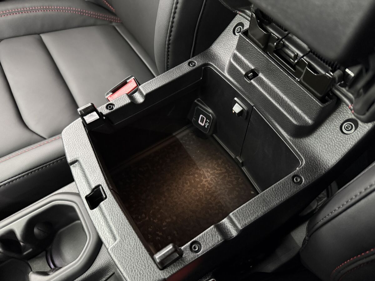 センターコンソールもレザー仕上げ、レッドステッチが入ってお洒落です。USB充電ポートが備わります。