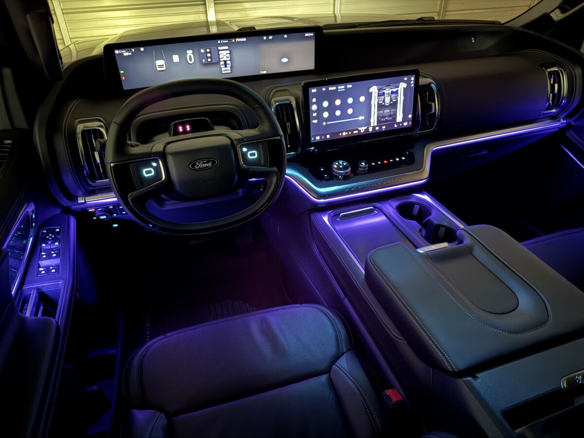 フォードF-150シリーズと共通デザインのコックピットとなっているエクスペディション。アメリカンカーメーカーの中でもフォードは日本人の感性に一番近いものがあり、機能を優先としたデザインに定評があります。