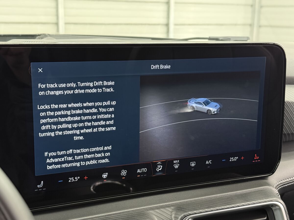 従来のレバーアクションハンドブレーキに寄せたデザインのエレクトリックパーキングブレーキが用意されました。ストッピングパワーも絶大で、通常のパーキングブレーキの4~5倍の力でリアホイールを即座にロックしてドリフト状態に持ち込むことが可能です。