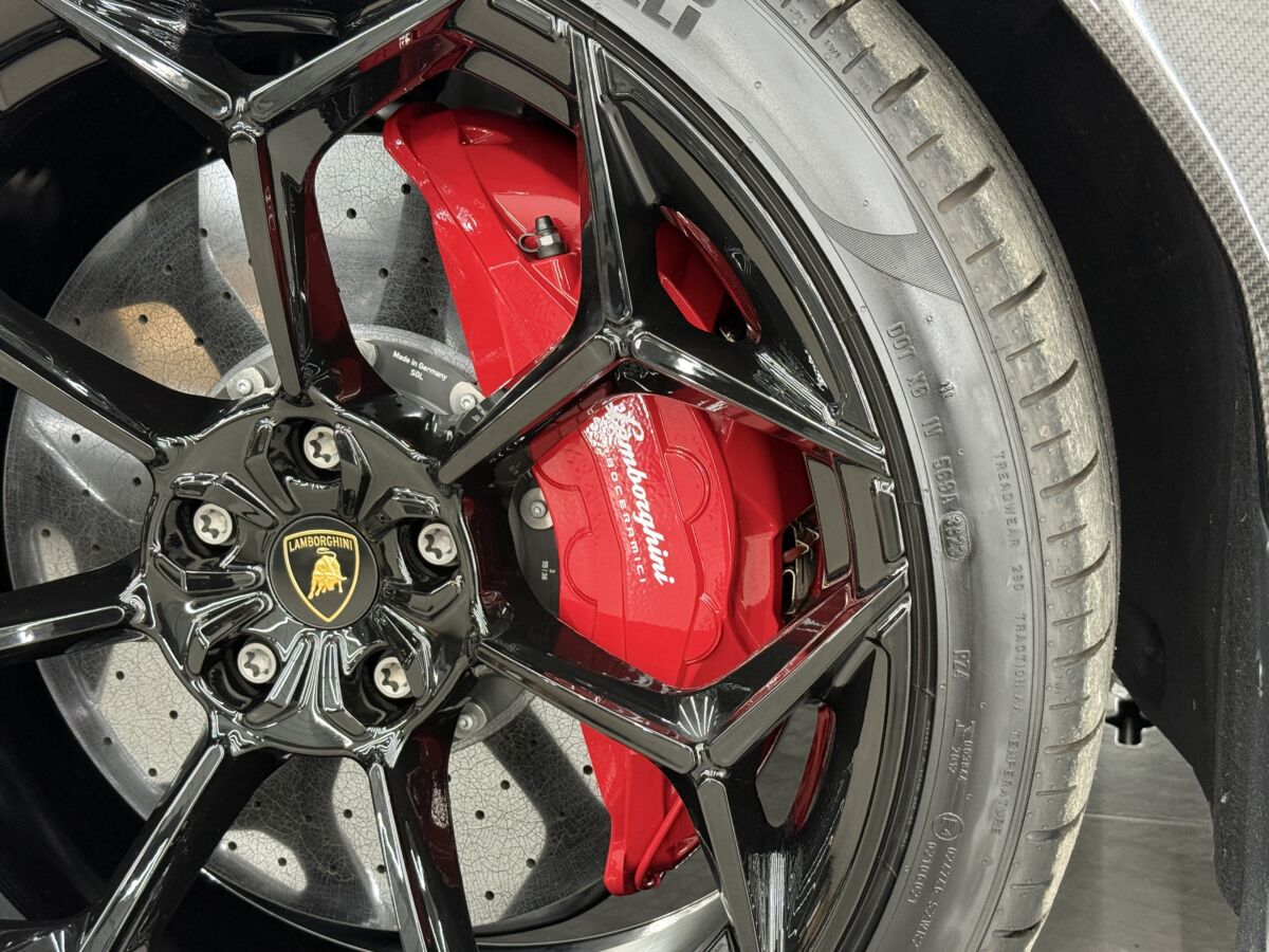 フロントブレーキは10ピストンキャリパーにカーボンセラミック製の440mmブレーキディスクが組み合わされます。レッドブレーキキャリパーもボディとの差し色で映えておりカッコ良いです!