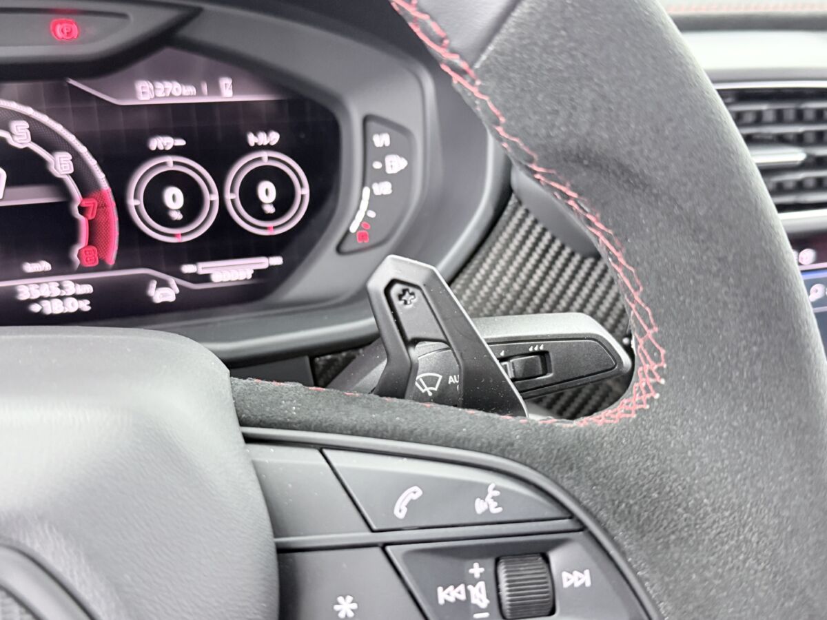 42万円のオプションとなるスポーツステアリングホイールアルカンターラレザーを搭載。ステアリングを操作して様々な情報をインフォメーション可能です。もちろんパドルシフトも付いています。