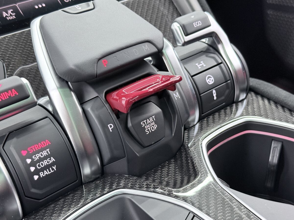 ドライバー側のレバーでは、ストラーダ(ノーマル)・スポーツ・コルサ(サーキット)・ラリー(グラベル&デザート)という4モードから好みのセッティングを選べます。エンジン、ステアリング、サスペンションを個別に設定できるEGOも備わります。