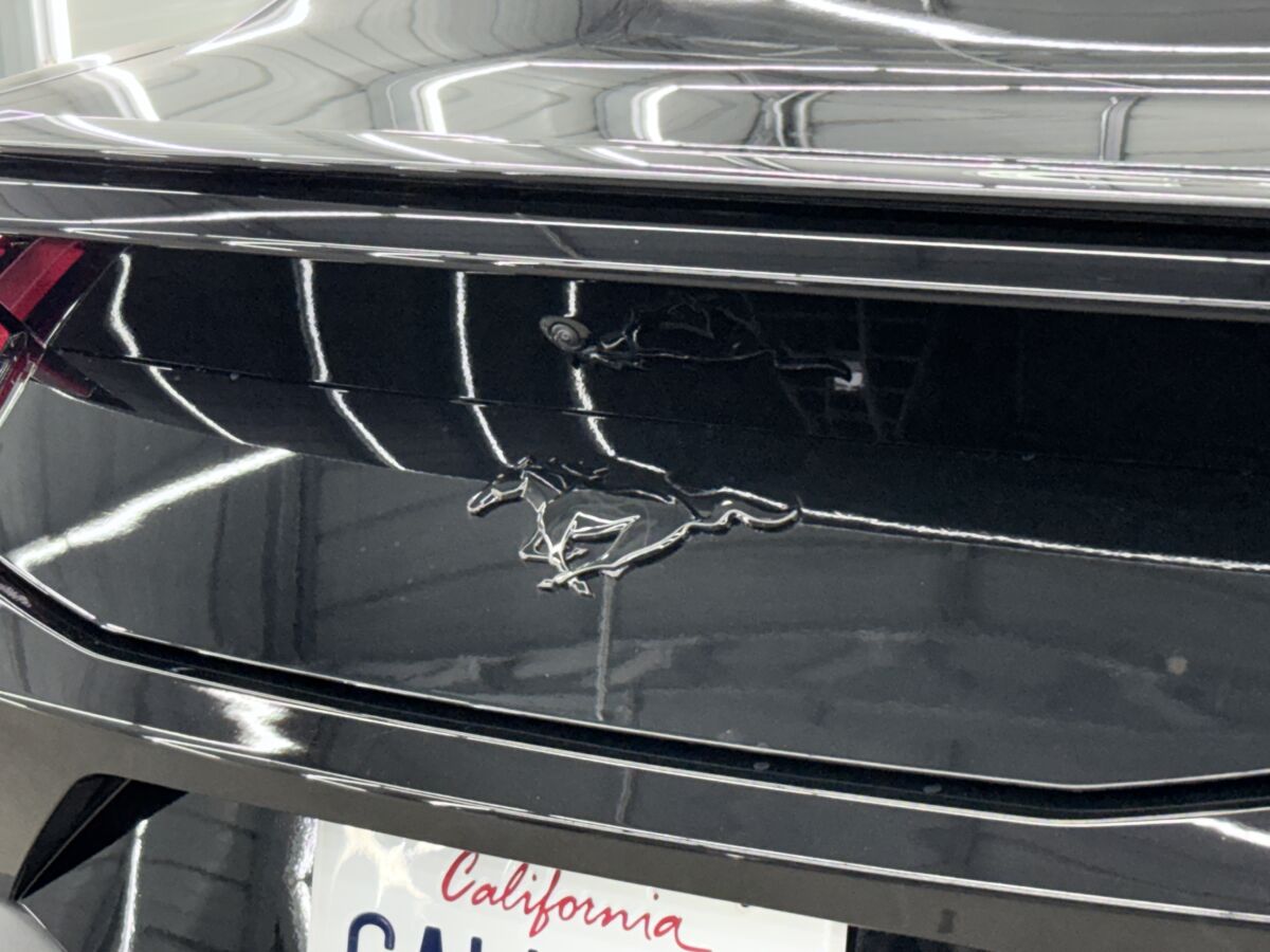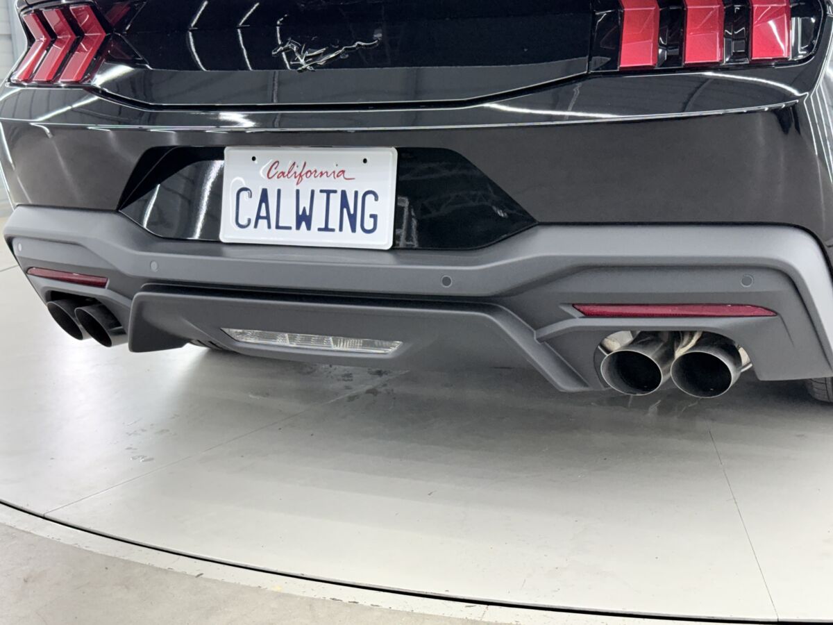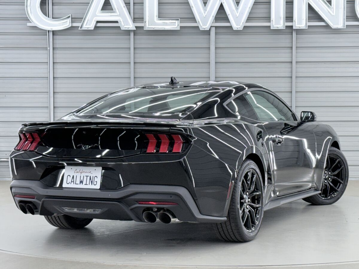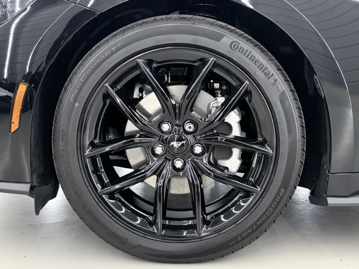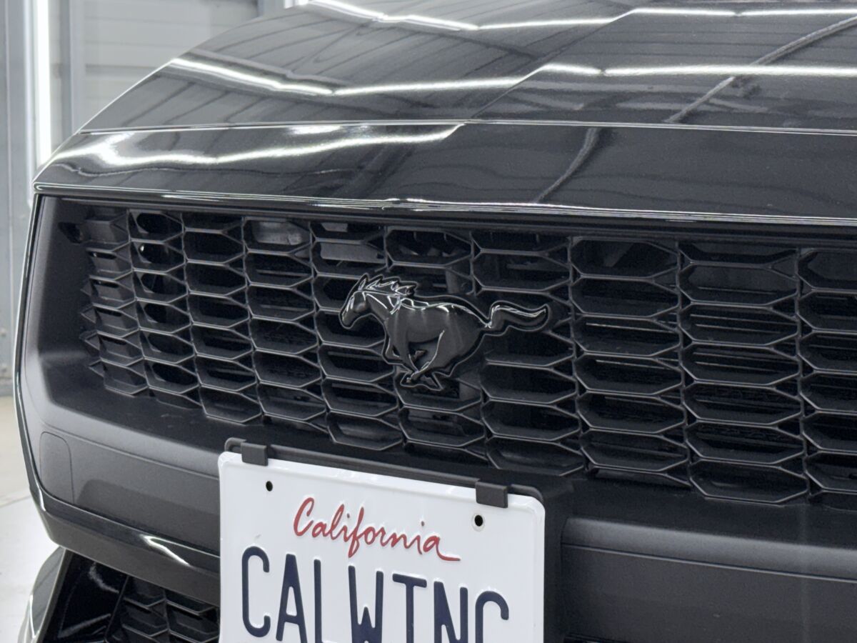 マスタングと言えば、ポニーエンブレムが非常に有名で、1965年の初代から受け継がれるアイコンとなっておりますが、今回の入庫車両が装着するナイトポニーパッケージには漆黒のポニーエンブレムが装着されています。控えめかつ、主張をしすぎない、エレガントなブラックポニーエンブレムは、オーナーの所有欲を満たすオシャレな雰囲気です。もちろん、リアもブラックエンブレムを装着済みです。