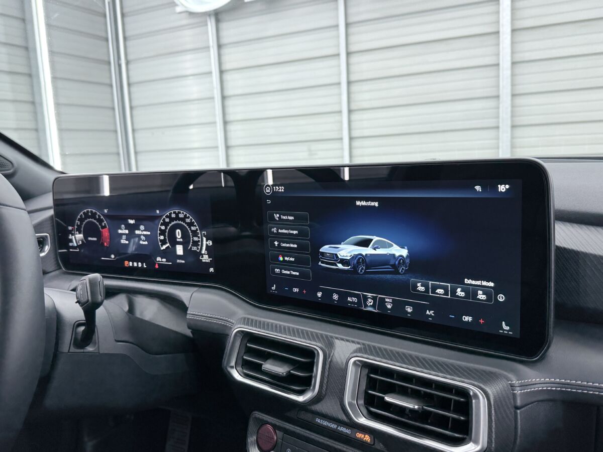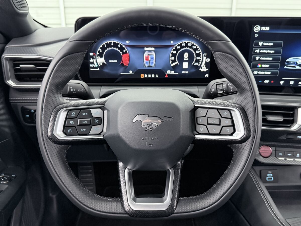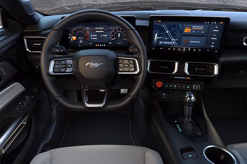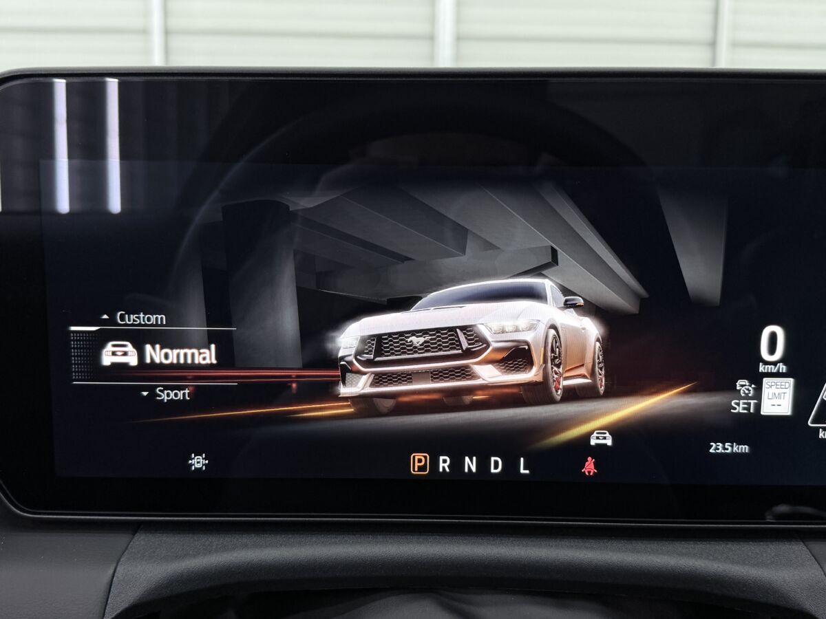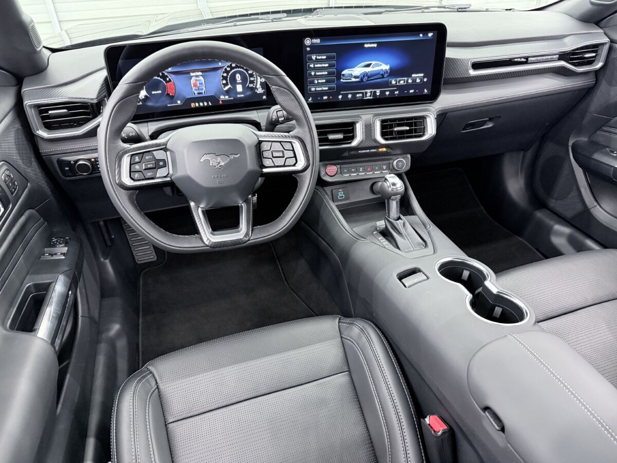 新型マスタングで劇的に変わったのは、間違いなくインテリアです。先代までのダブルバブルと呼ばれるダッシュボードをはじめとしたクラシカルなスポーツカー的要素は姿を消し、開発者曰くゲームで育った新世代のユーザーを意識し、モニターでドライビングシュミレーターの様な要素を取りこんだとのこと。目に飛び込んでくるのは、ドライバーを取り囲むファイター(戦闘機)スタイルのデジタルパネルです。