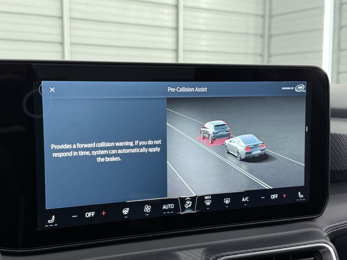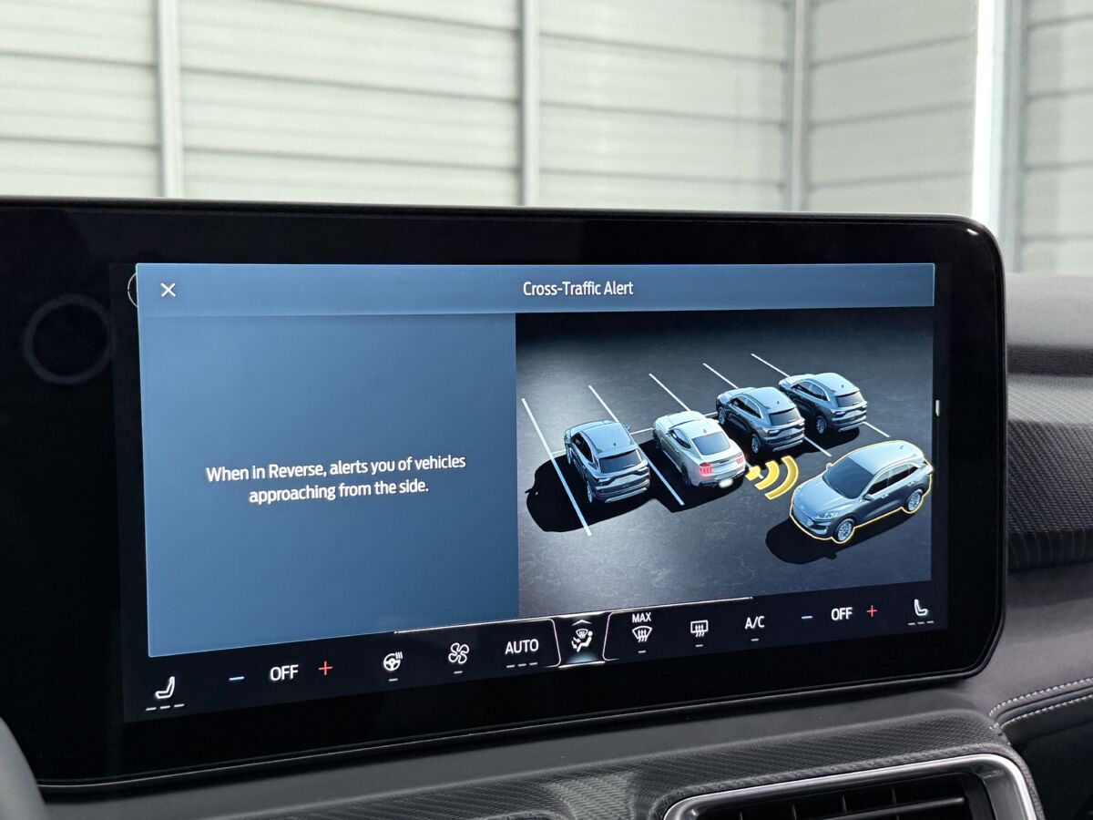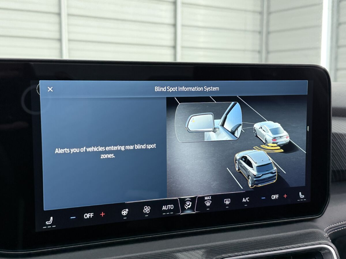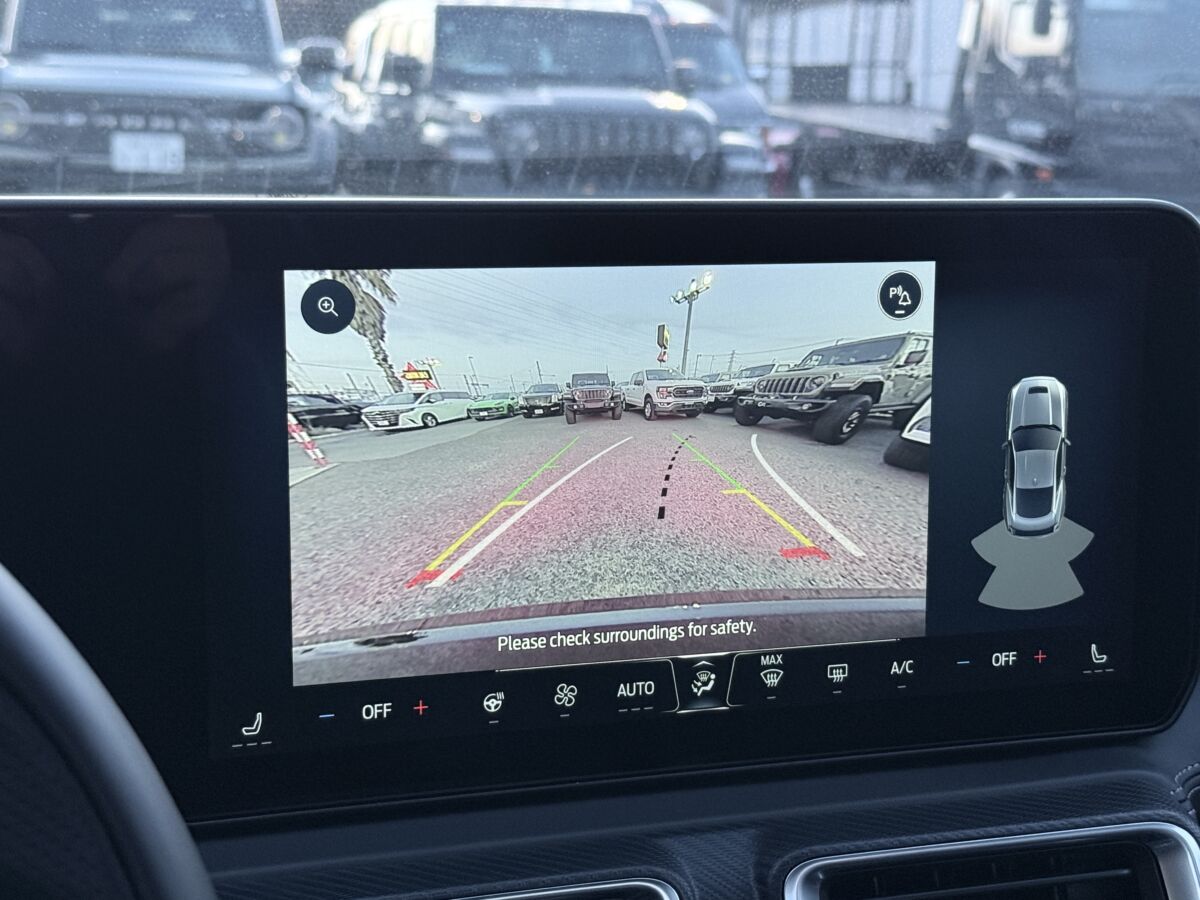 クーペボディの後方視界は、何かと心配もあるかと思います。ただ、こちらのマスタングのモニターを確認すると、広角視野でガイドラインも非常に分かりやすく、不慣れな駐車場などでも安心して駐車が可能です。実はカメラモニターの画像が低い視点であることも、駐車枠へのエントリーのしやすさにもつながっていると感じます。車両の進行方向を掴みやすいところがポイントとなっています。