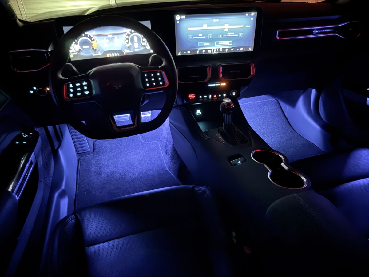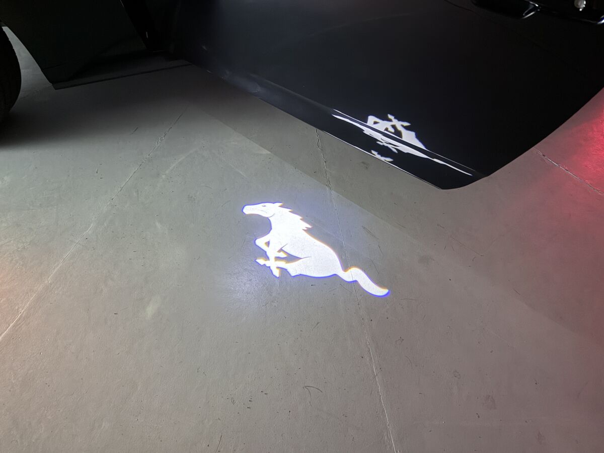 ドアを開くと、LEDライトが発光し、地面にポニーロゴが照らし出されます。夜間に乗降する際にもマスタングオーナーとのしての所有欲を満たすアクセントとなっいています。