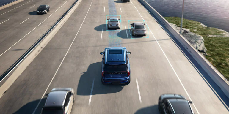 フロントワイドビューは約170°のワイドな前方視界をデュアル14.3インチの高精細ディスプレイに投影。見通しの悪い交差点やブラインドコーナーでも、周囲の状況を的確に把握し、安全な走行をサポートします。3Dエンハンスド インテリジェントアラウンドビューモニターは、3Dビュー機能により、車両を中心にカメラ視点を自在に回転。周囲の状況を直感的に把握でき、狭所での取り回しや駐車時も、これまでにない安心感と「どこにもぶつけない」を実現してくれます。