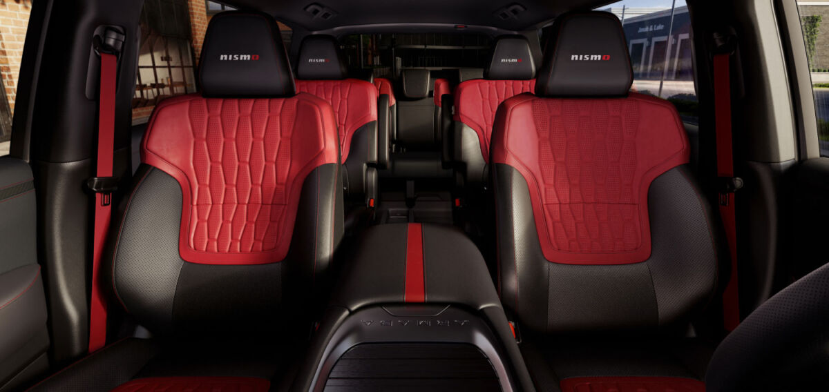 NISMO専用シートには、ブラックレザーに赤いキルティング加工が施され、随所にあしらわれたNISMOロゴの刺繍とともに、スポーティかつ上質な室内空間を演出します。