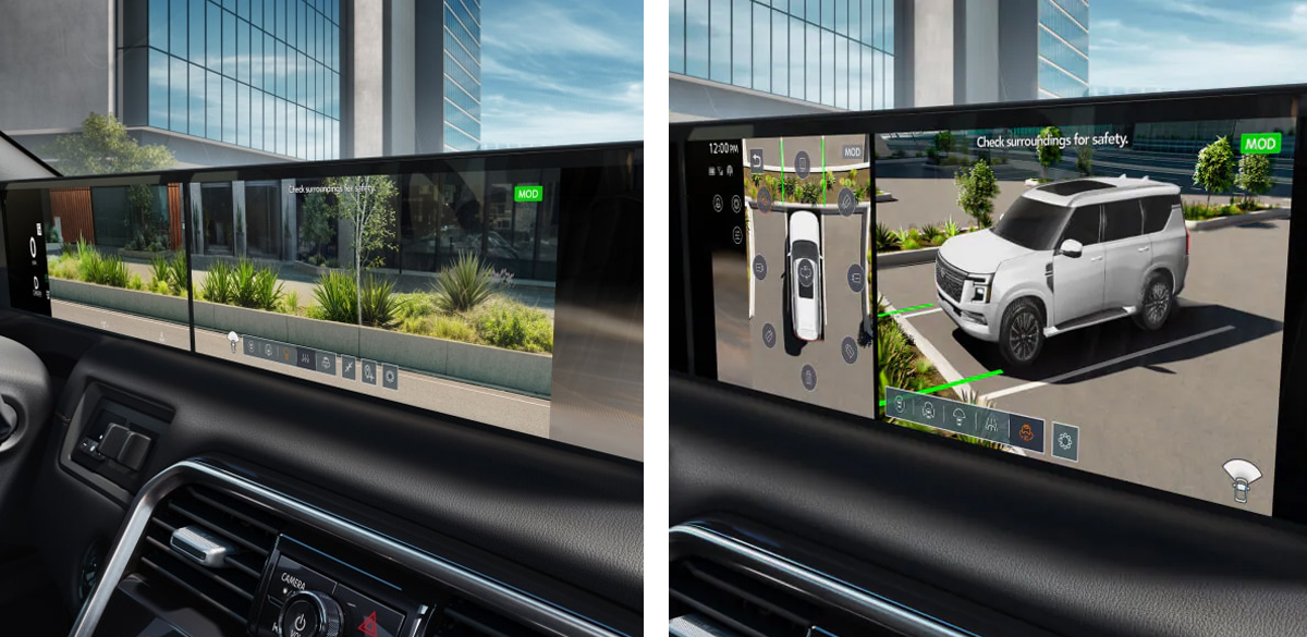 『インビジブルフードビュー』『フロントワイドビュー』と『3Dインテリジェント アラウンドビューモニター(I-AVM)』をデュアルモニターの大画面で表示するアルマーダ。最先端のデジタルテクノロジーを活用してボンネットで死角になりやすい直前の路面をデジタル映像化。狭い駐車場や縁石、オフロードの障害物までインストルメントパネルのデュアルモニターに投影します。