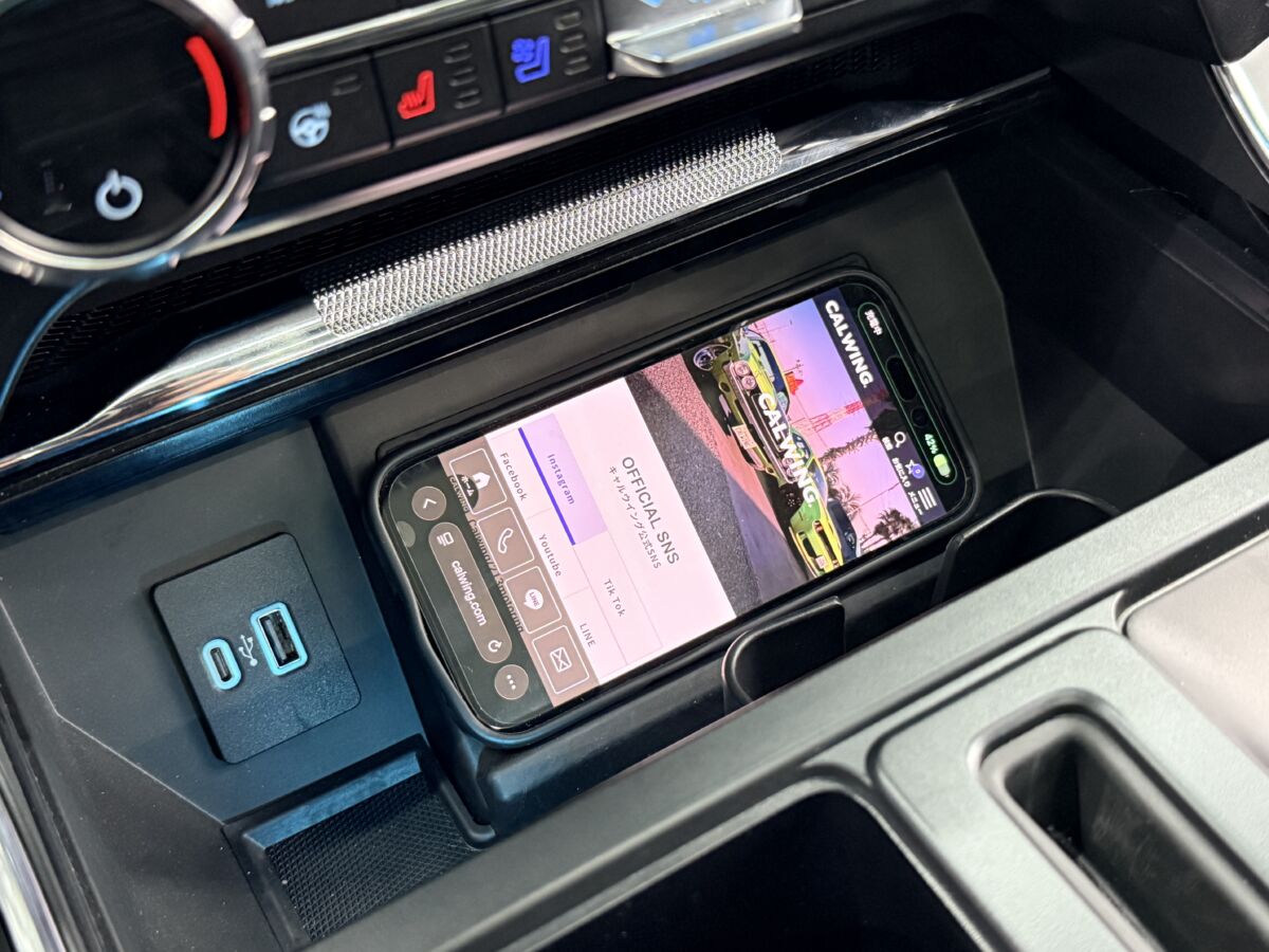 お持ちのスマートフォンと接続して、マップ機能(ナビゲーション)やスポティファイなどの再生、繋いでいるのはご自身のスマホになりますので、もともと最大限自分好みに設定済み。この機能を国産車とは段違いの巨大なディスプレイで使用できるのが、ラプターのポイントです。