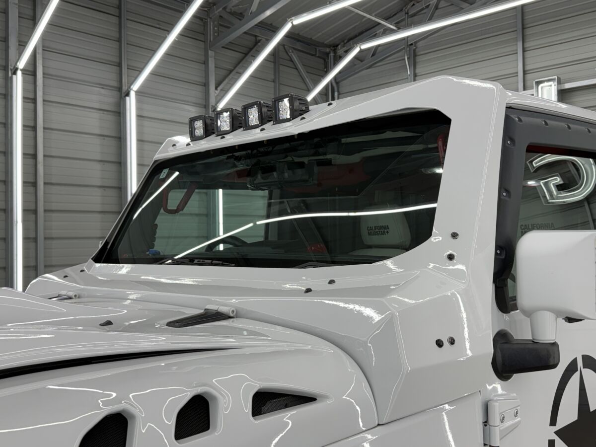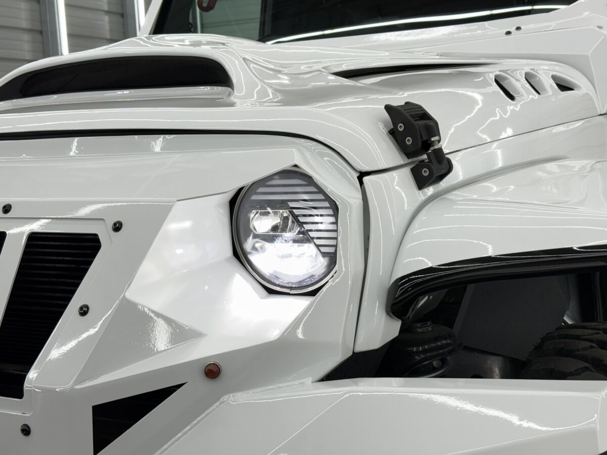 ペイントもほぼ車両全体にわたってリペイントされている為、ノーマルラングラーとは一線を画したエクステリアとなりました。装甲車のような外装でありながら、どこかモダンな雰囲気も感じるポイントです。