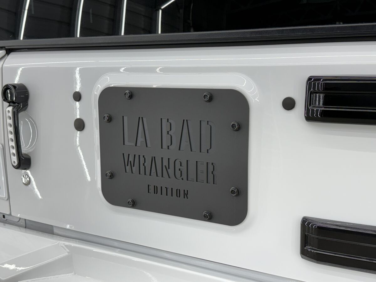 リアには、LA BAD WRANGLERロゴ入りテールゲートカバーを装着。背面のスペアタイヤを取り外した際に露出するマウント部や取付穴をカバーし、テールゲート周りをすっきりと仕上げています。
