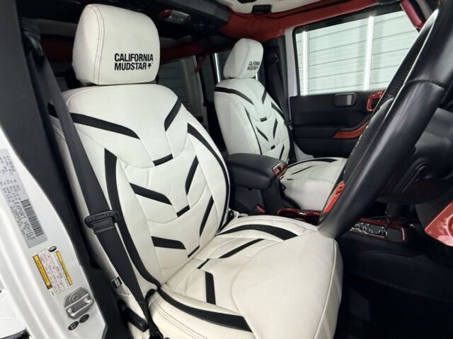 インテリアには、CALIFORNIA MUDSTAR製カスタムシートカバーを装着。ホワイト×ブラックのコントラストに、ブランドロゴをあしらった専用デザインにより、室内空間を大きく印象付けています。
