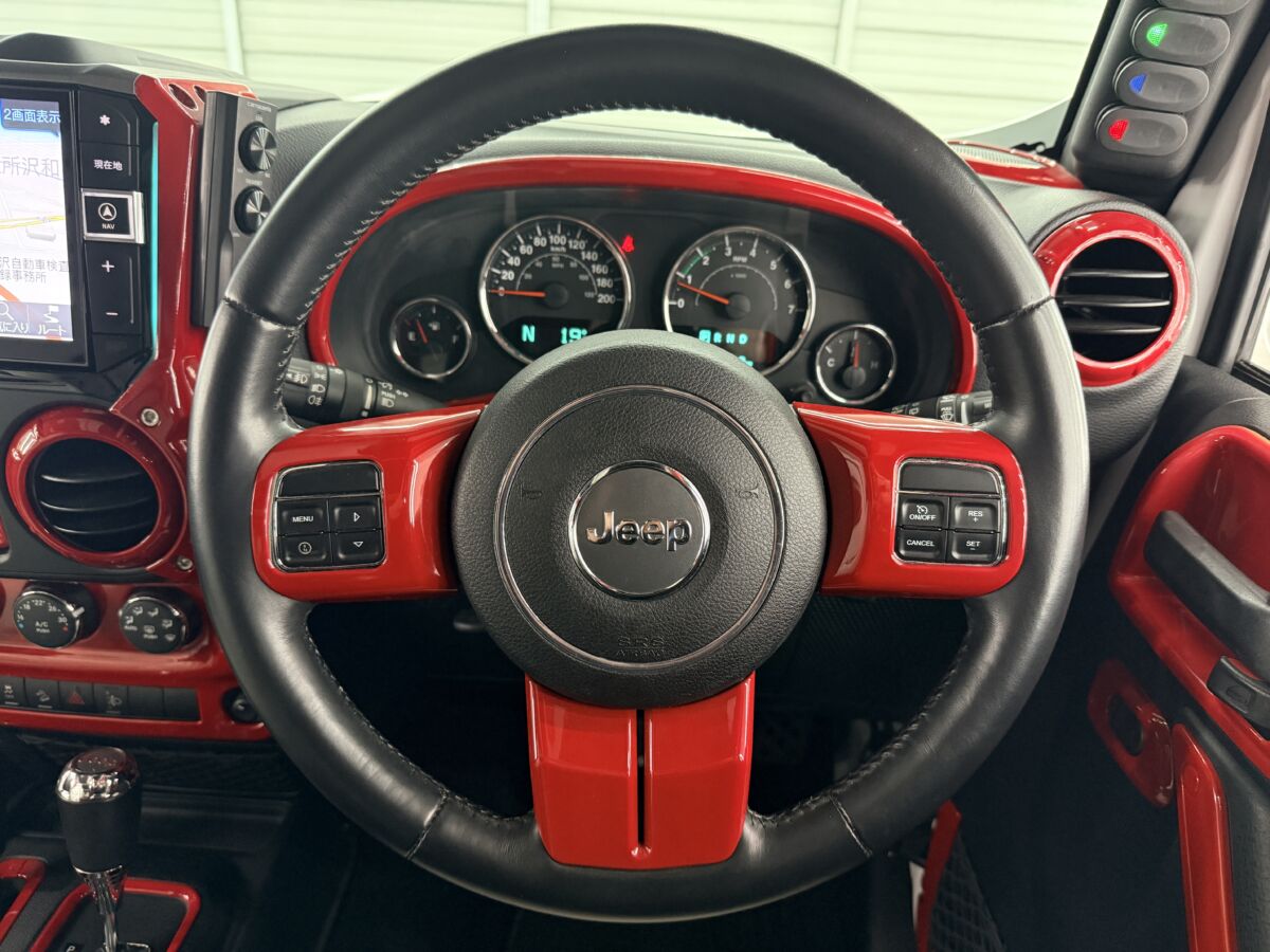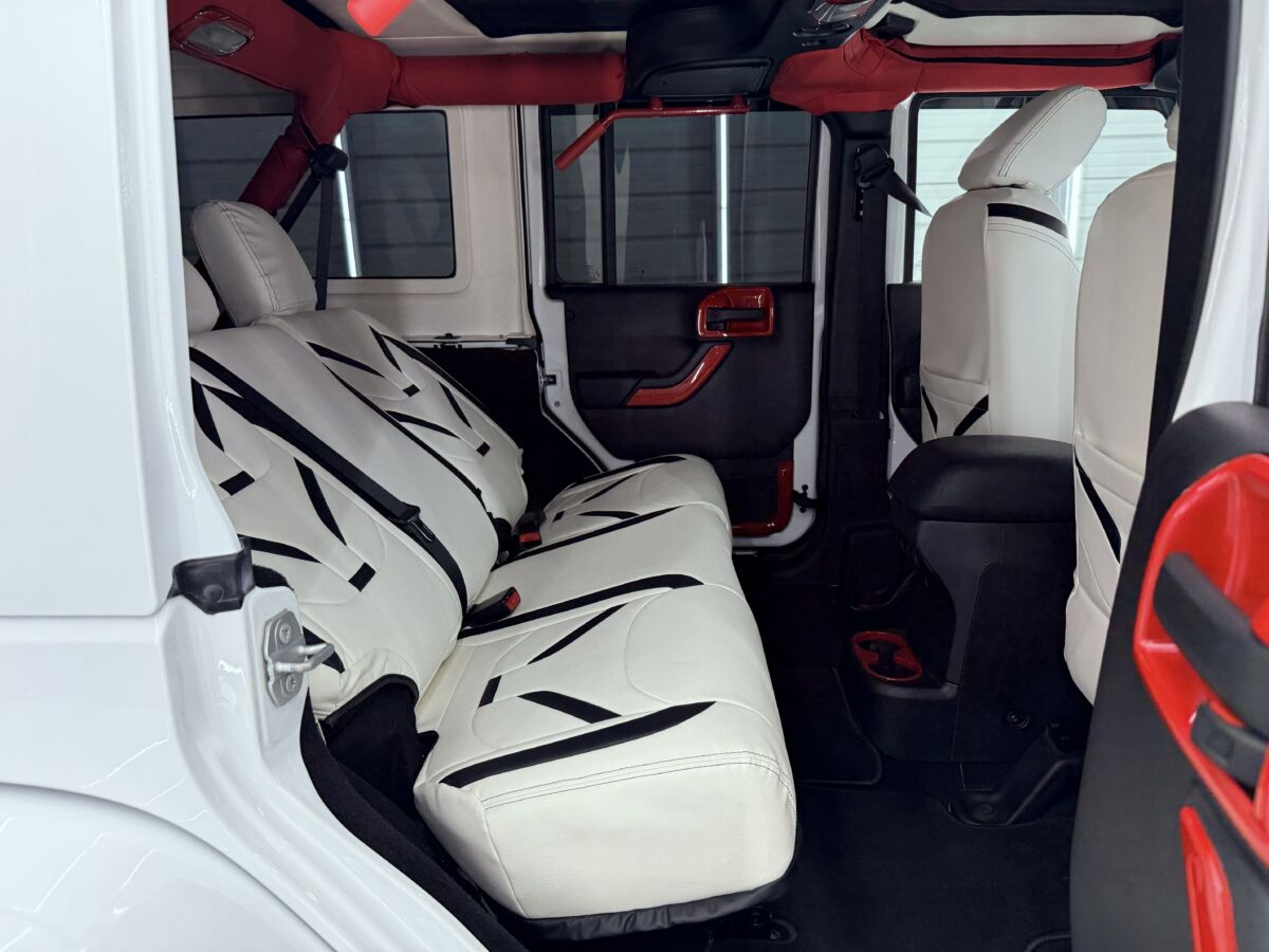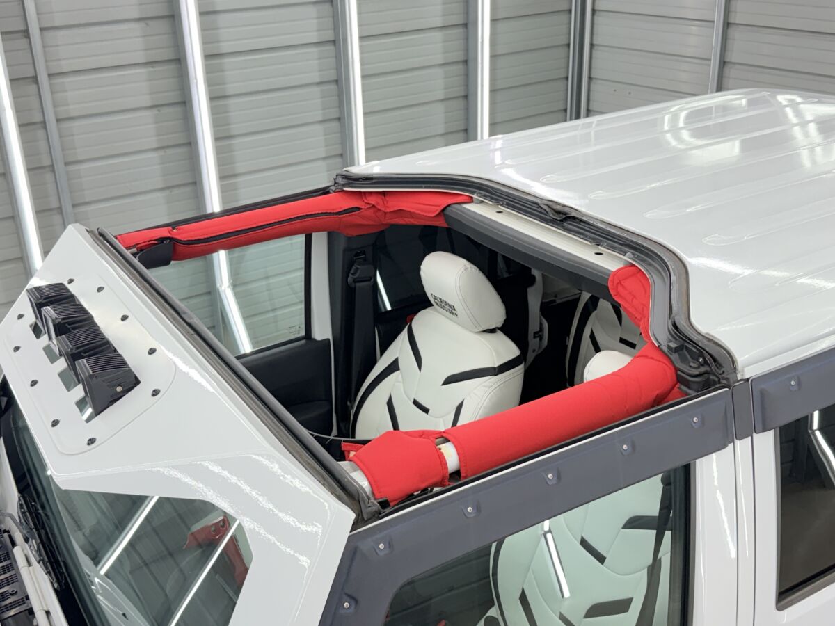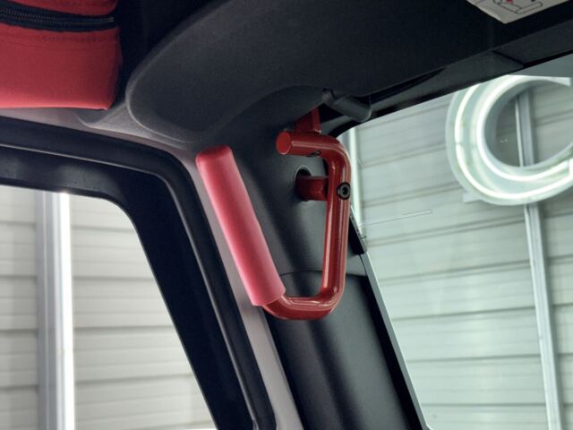 ホワイトレザーシート打って変わって燃えるようなレッドレザーカラー。インテリアトリムのレッドカラーとコーディネイトされています。ラングラー特有の無骨なロールバーを“魅せる内装パーツ”へと昇華し、シートカバーとの組み合わせによってインテリア全体の統一感を演出。視覚的なインパクトだけでなく、触れた際の質感や安心感まで含めて、内装のクオリティを一段引き上げるカスタムとなっています。