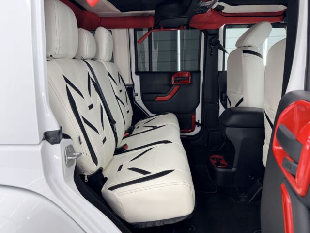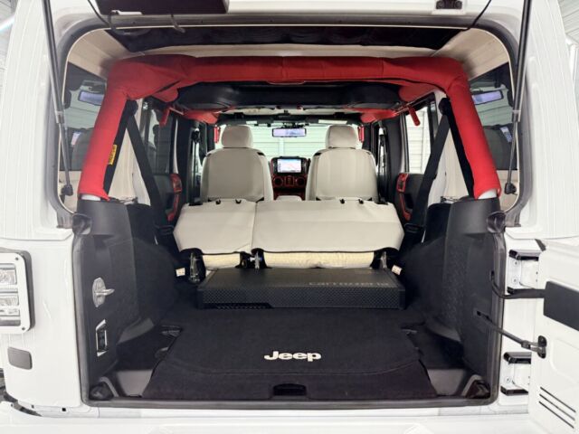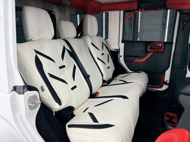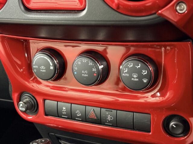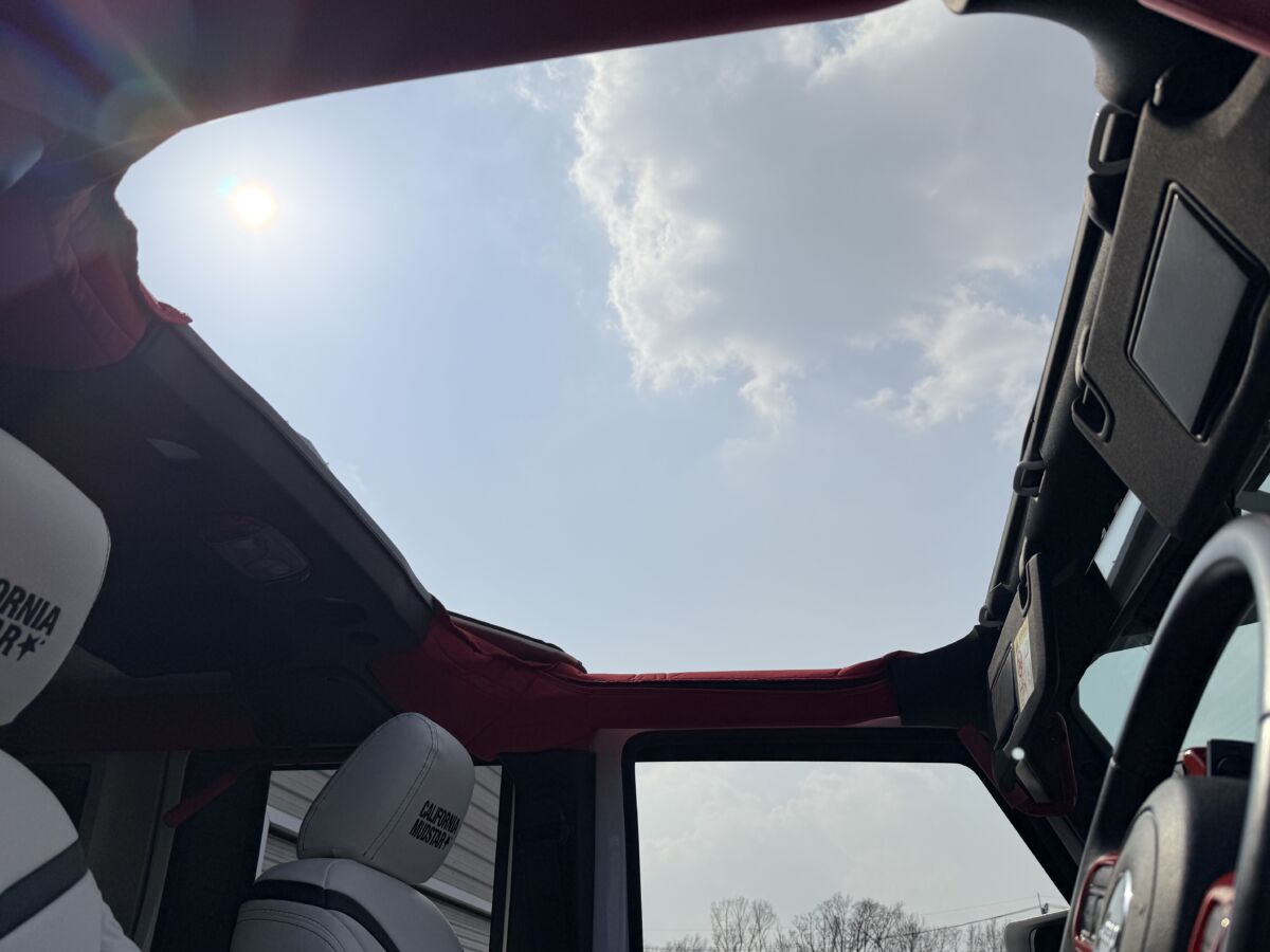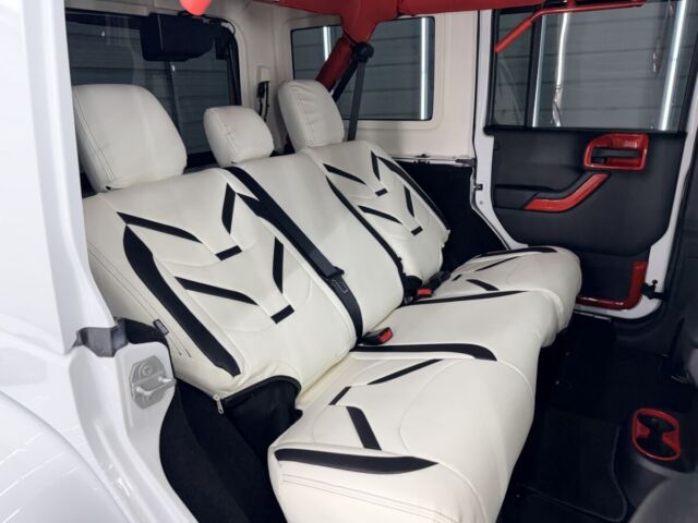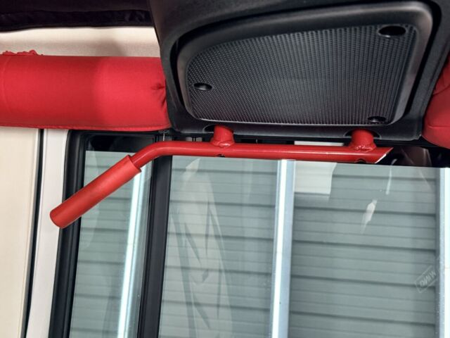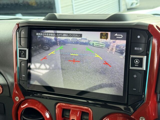 ホワイトレザーシート打って変わって燃えるようなレッドレザーカラー。インテリアトリムのレッドカラーとコーディネイトされています。ラングラー特有の無骨なロールバーを“魅せる内装パーツ”へと昇華し、シートカバーとの組み合わせによってインテリア全体の統一感を演出。視覚的なインパクトだけでなく、触れた際の質感や安心感まで含めて、内装のクオリティを一段引き上げるカスタムとなっています。