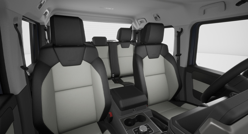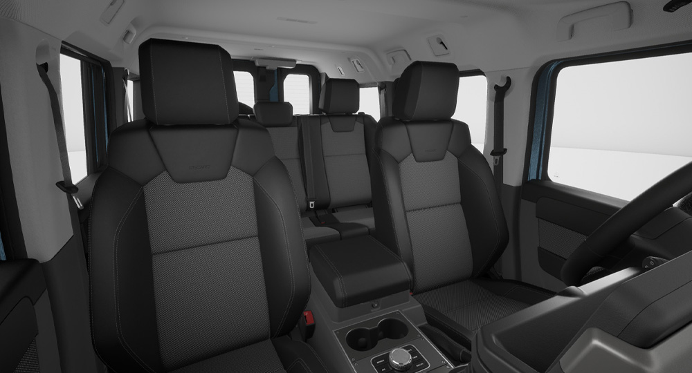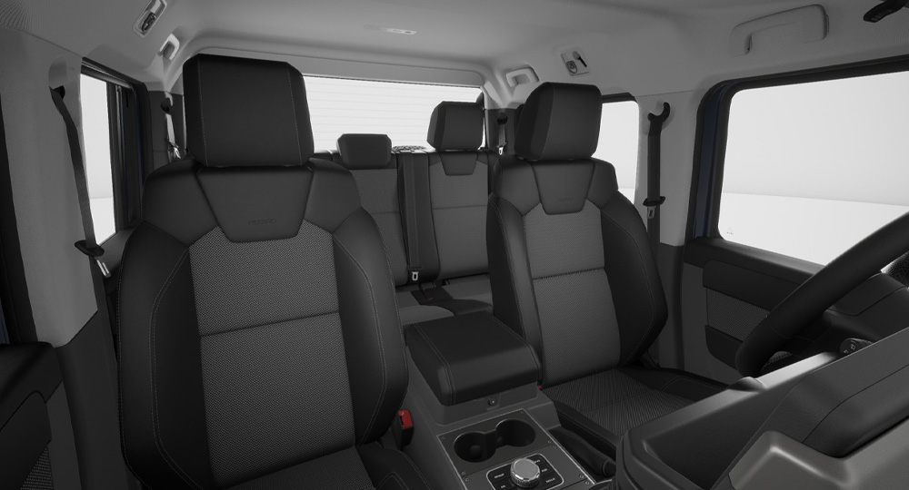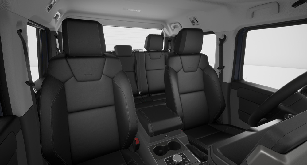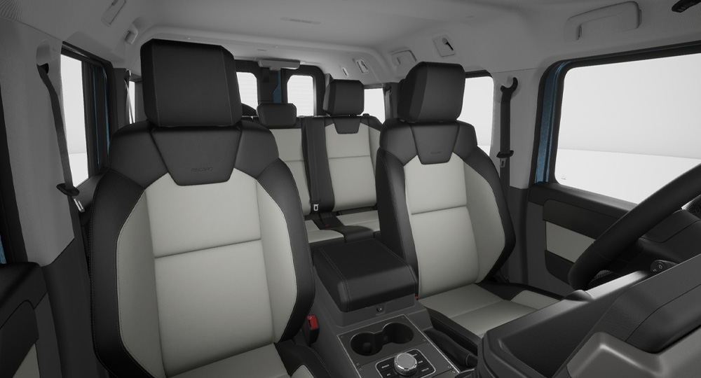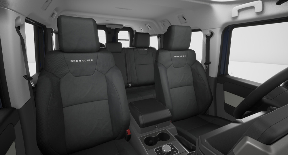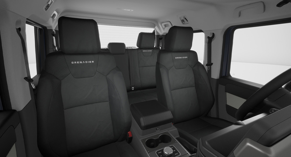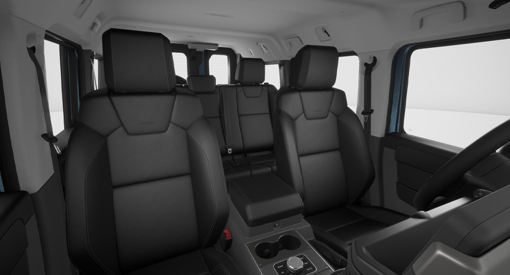 グレナディア専用に設計された8ウェイ手動調整式レカロシートを全グレードに採用。高い横方向サポートにより、悪路走行時でも身体をしっかりと支え、安定した着座姿勢を保ちます。クッションボルスターは薄型設計で、乗り降りもスムーズ。