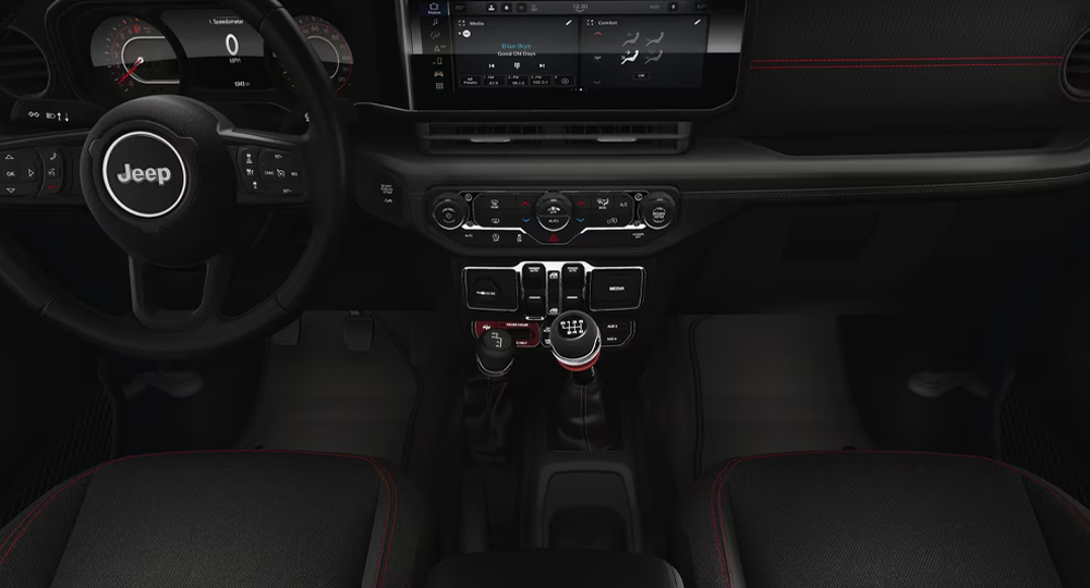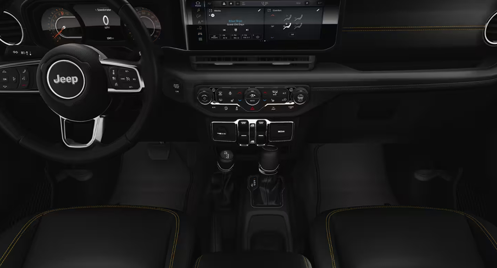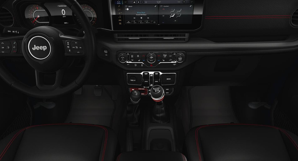 インテリアでは、全グレードにラングラー史上最大の12.3インチの大型モニターを採用し、使い勝手が各段に向上しました。インフォテイメントシステムは、最新のUconnect5を搭載しています。